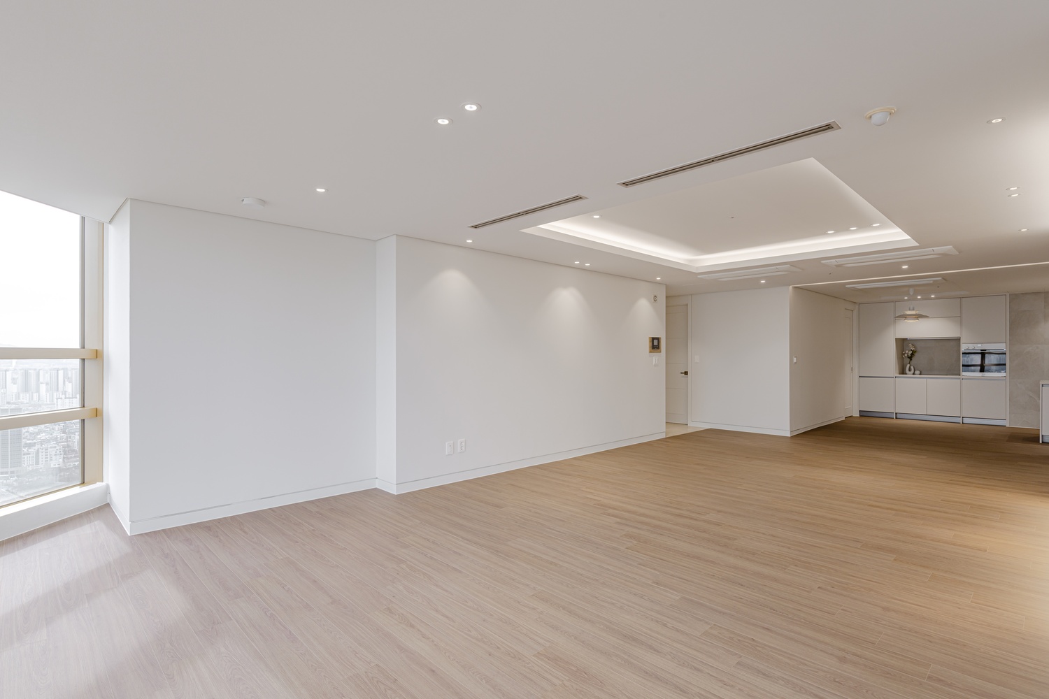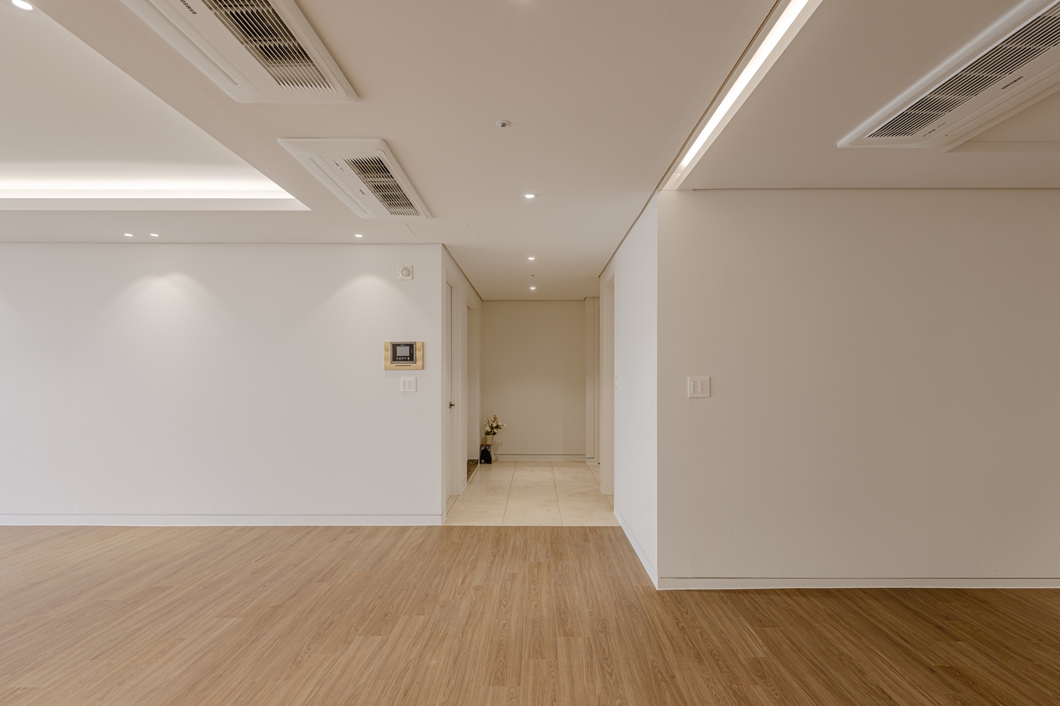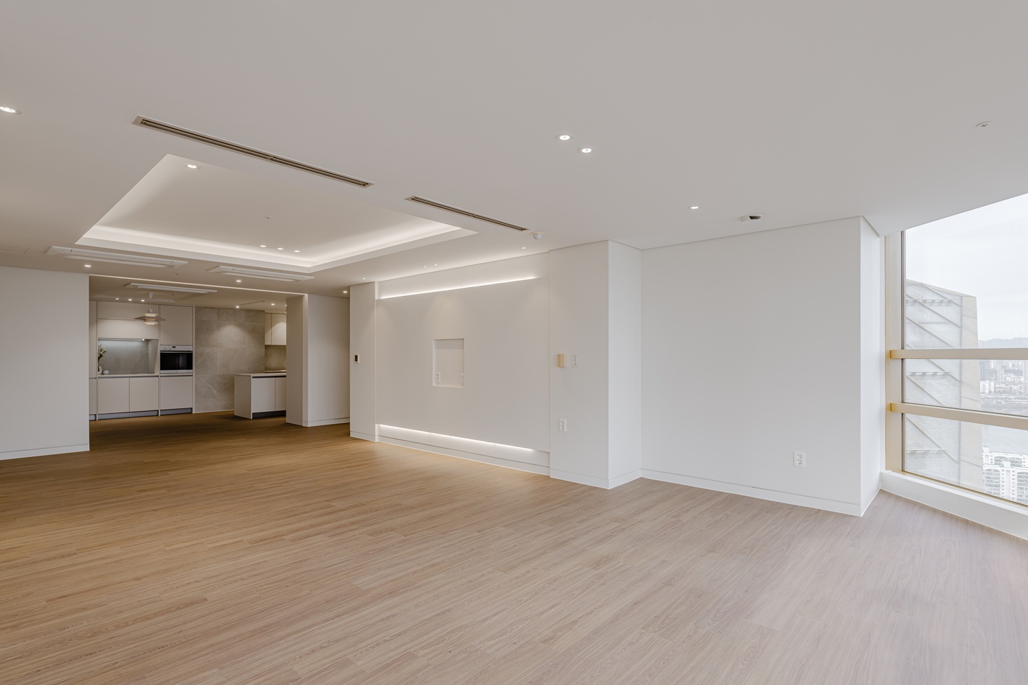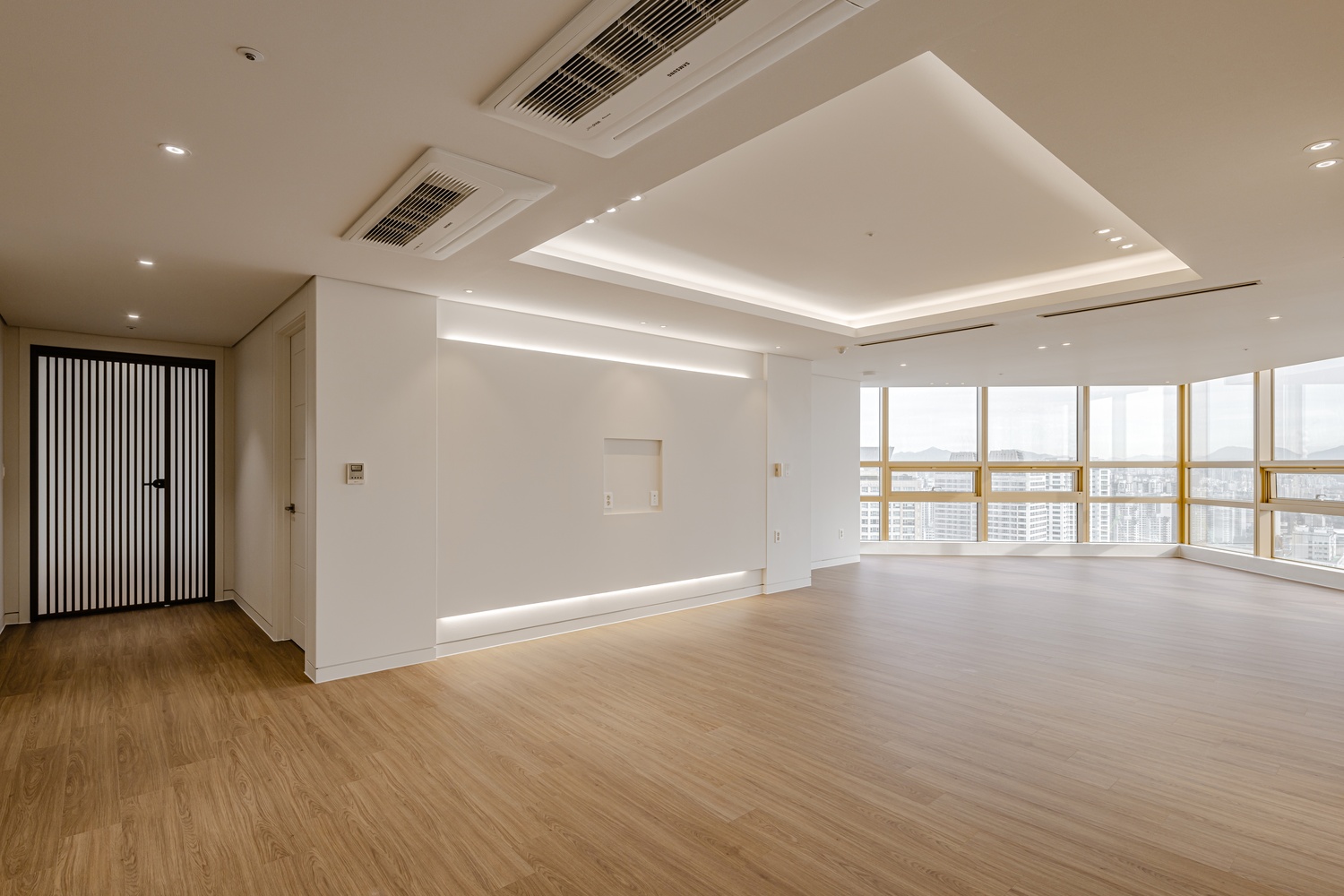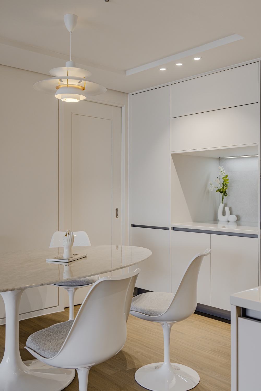 화이트 톤 벽면과 따뜻한 우드 플로어의 조화는 골드 포인트를 더욱 돋보이게 하고, 천장 매립 조명과 간접 조명은 공간에 깊이감을 더해 세련된 무드를 강화합니다.