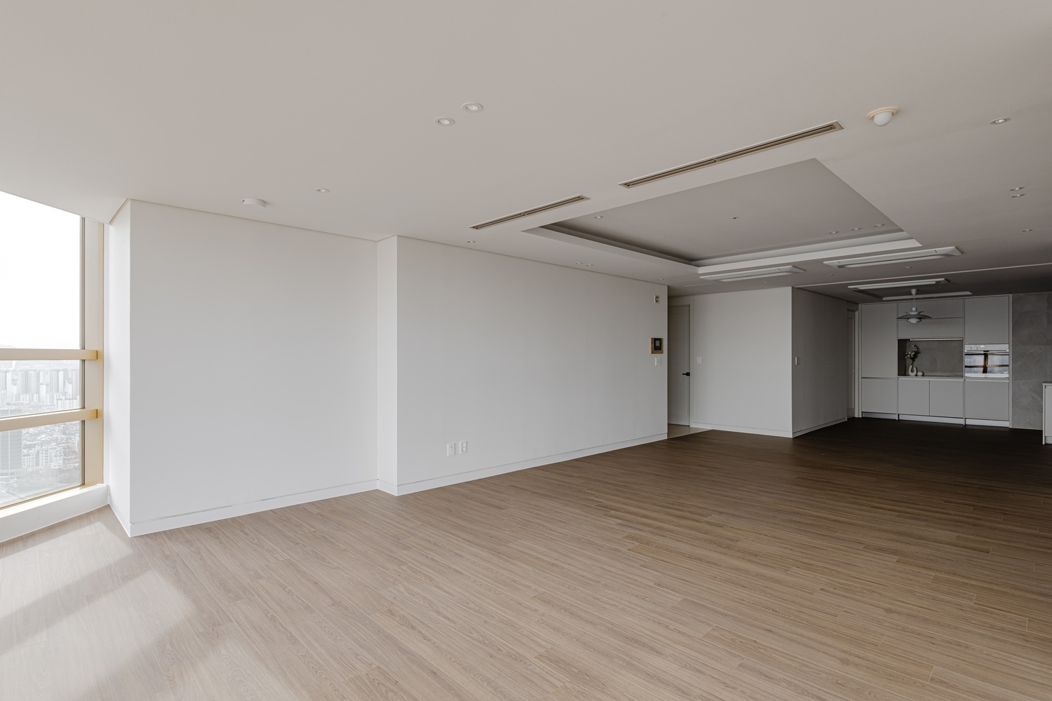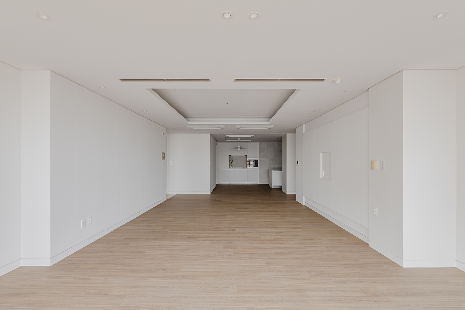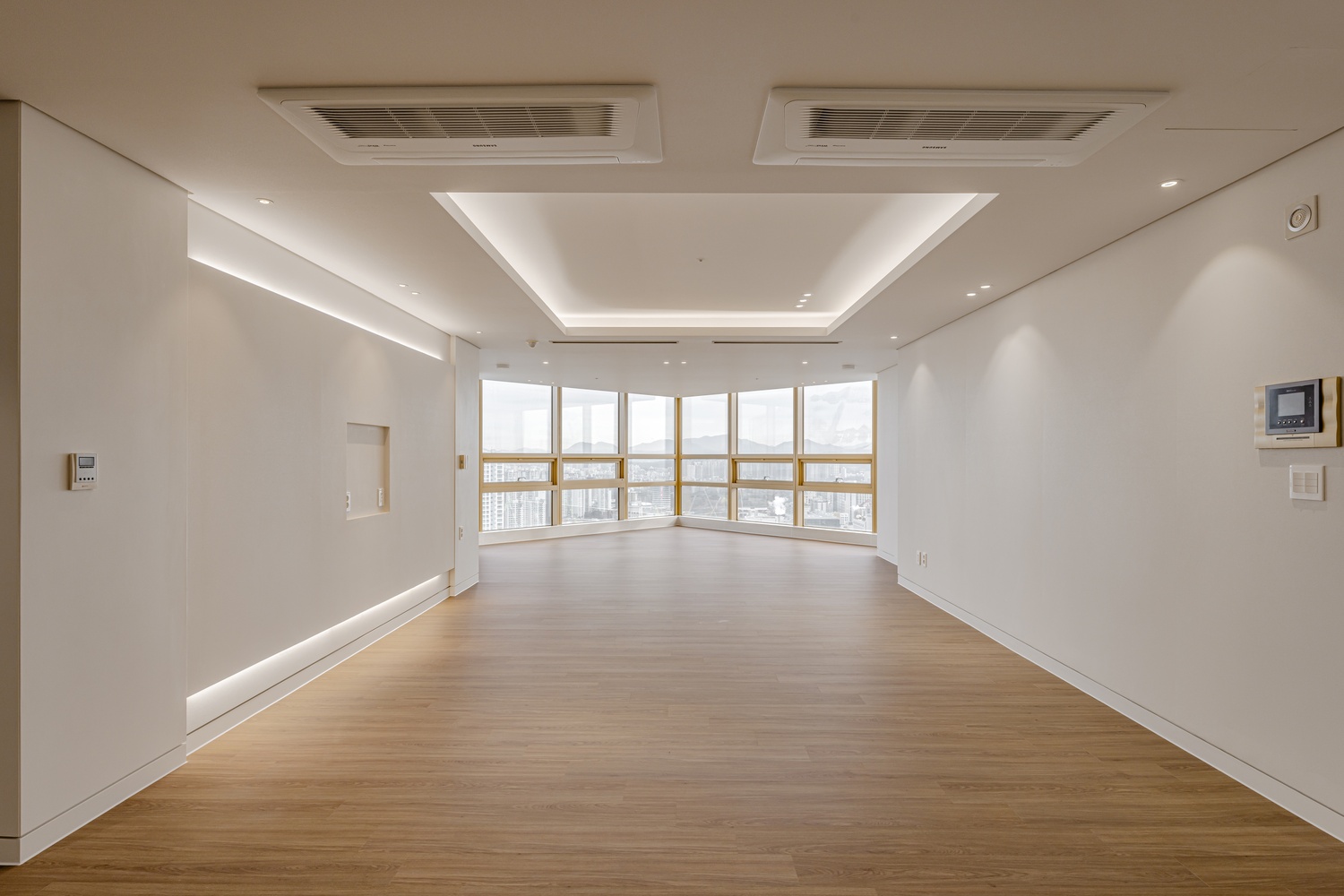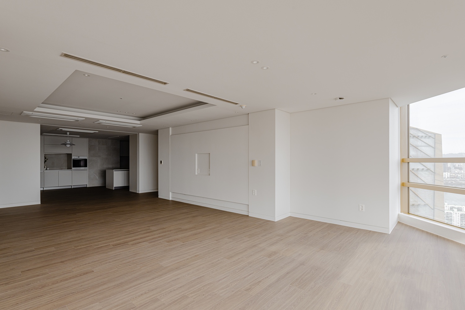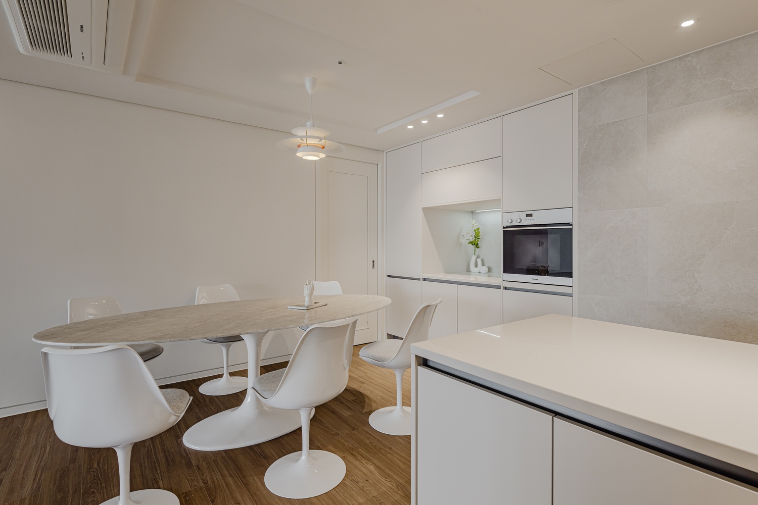 화이트 톤 벽면과 따뜻한 우드 플로어의 조화는 골드 포인트를 더욱 돋보이게 하고, 천장 매립 조명과 간접 조명은 공간에 깊이감을 더해 세련된 무드를 강화합니다.