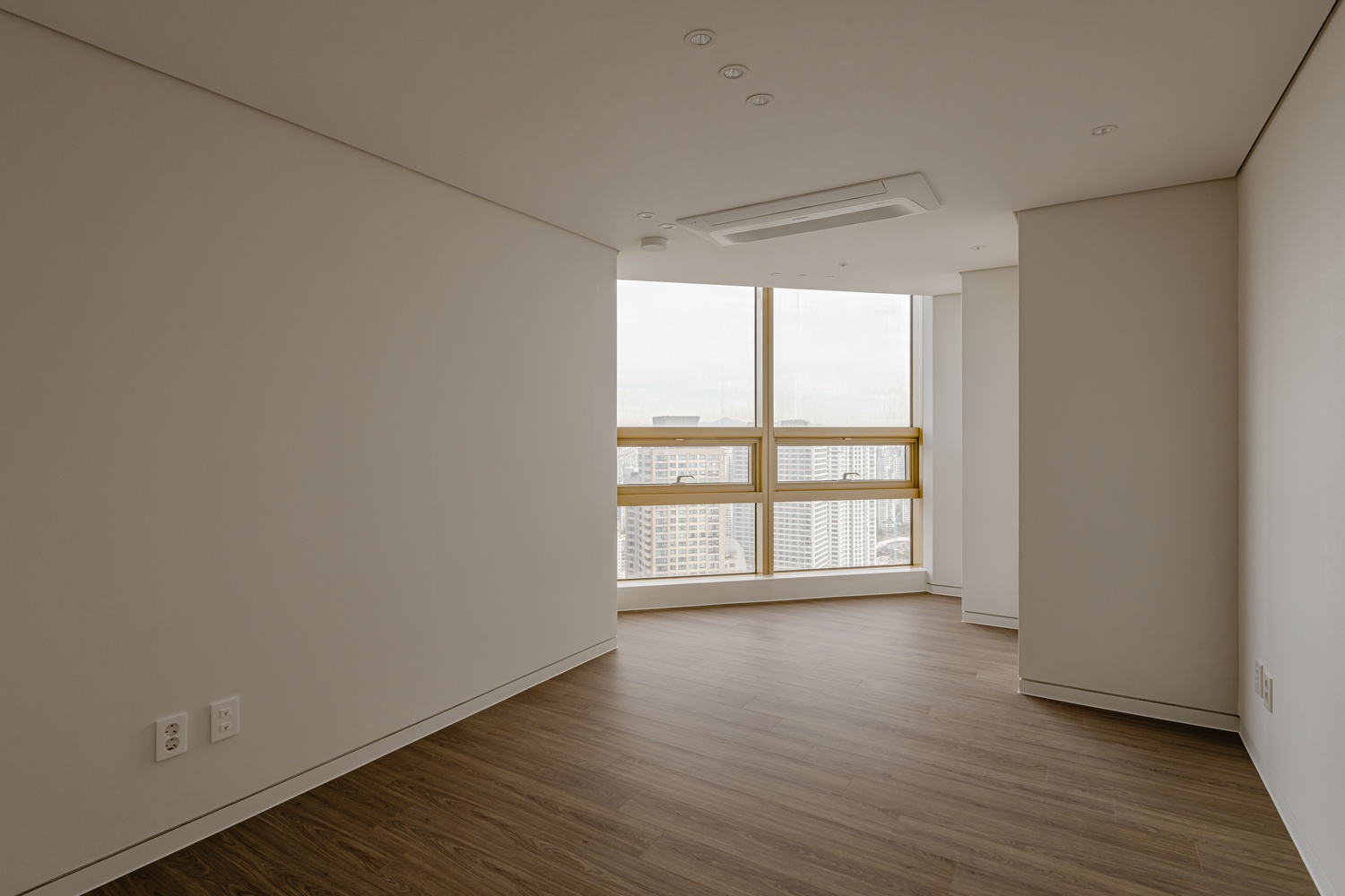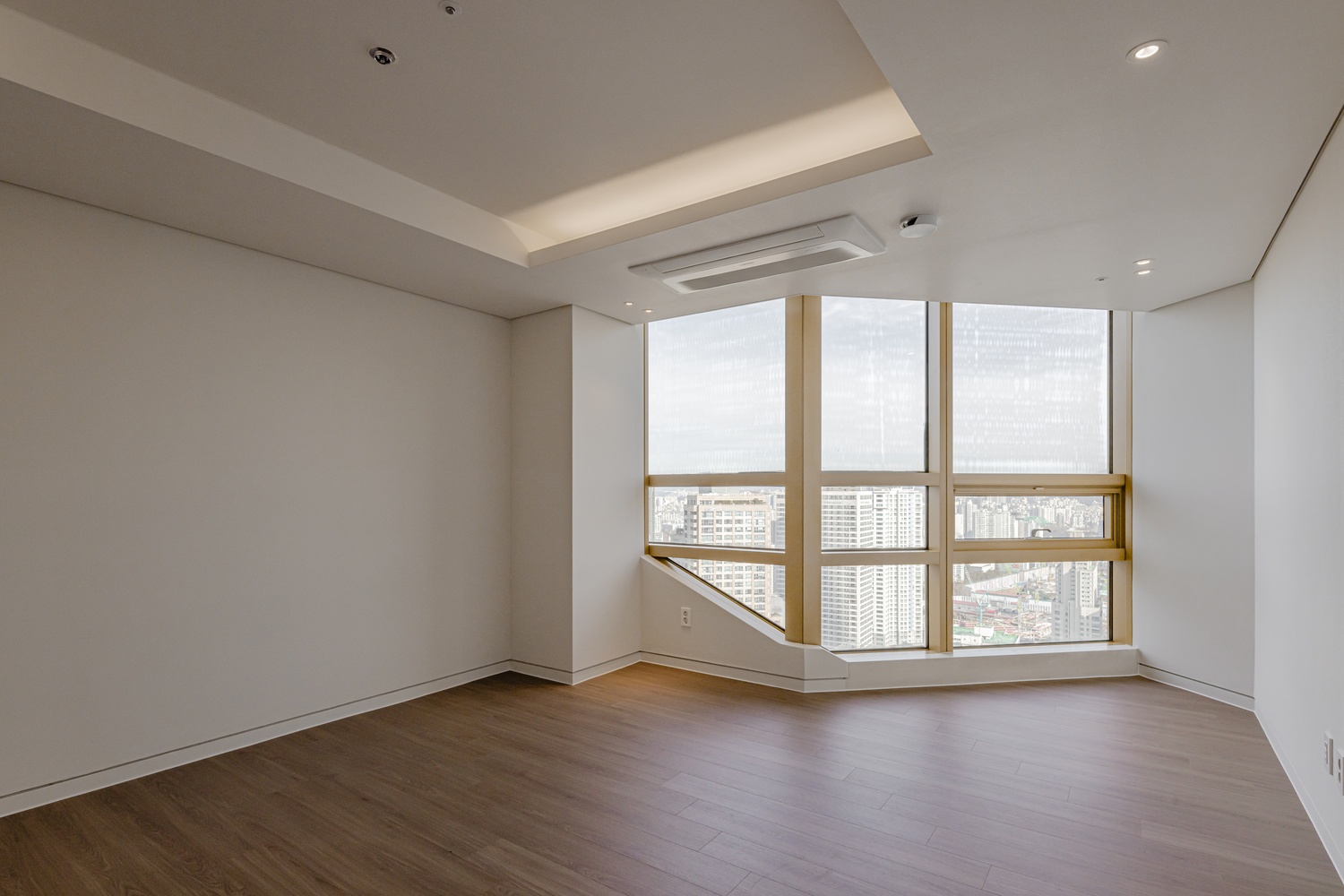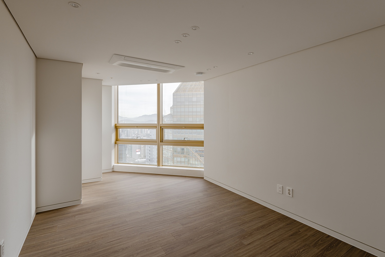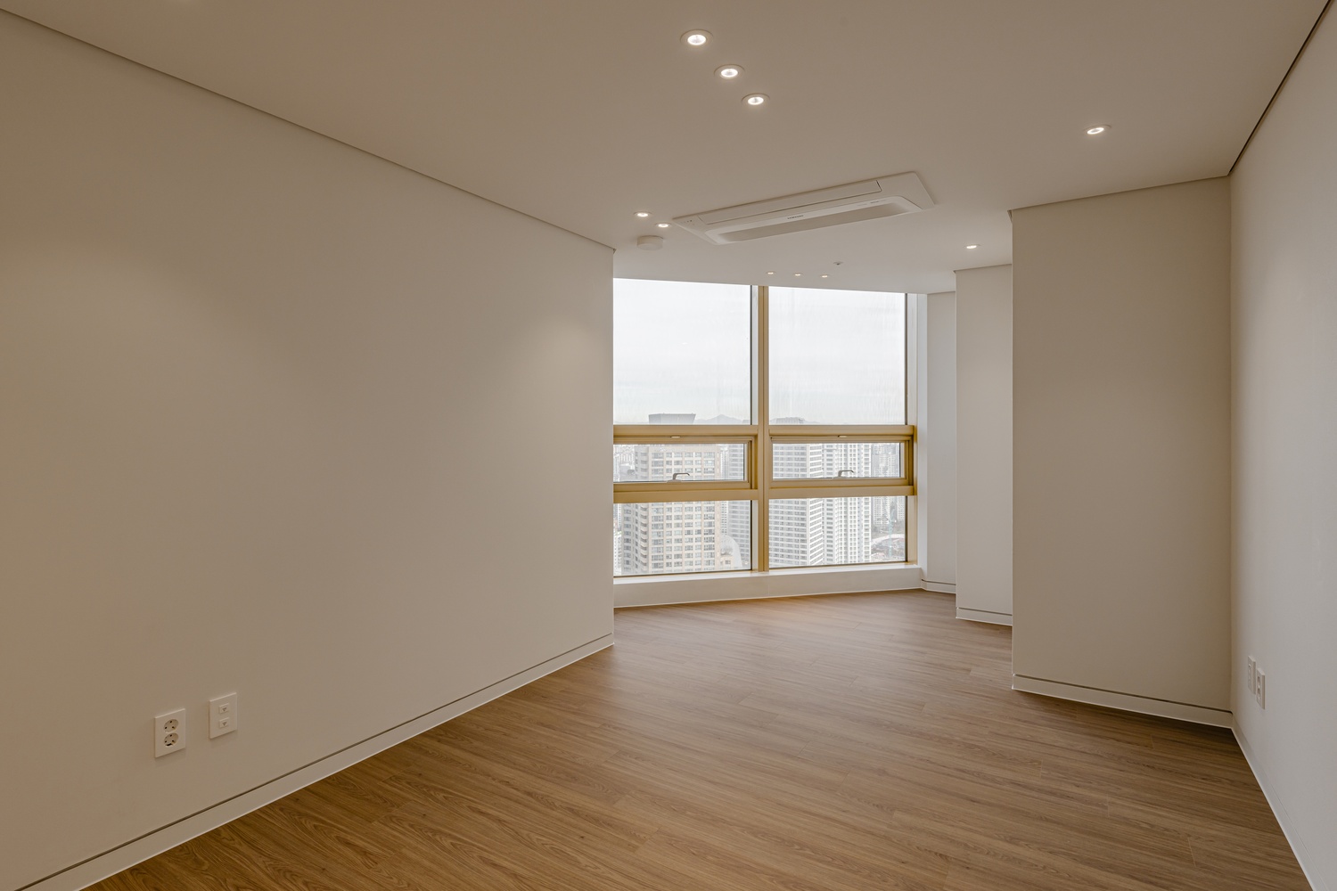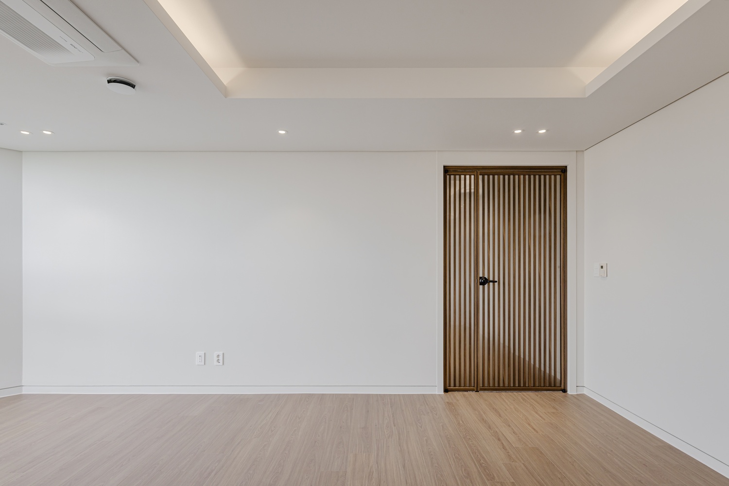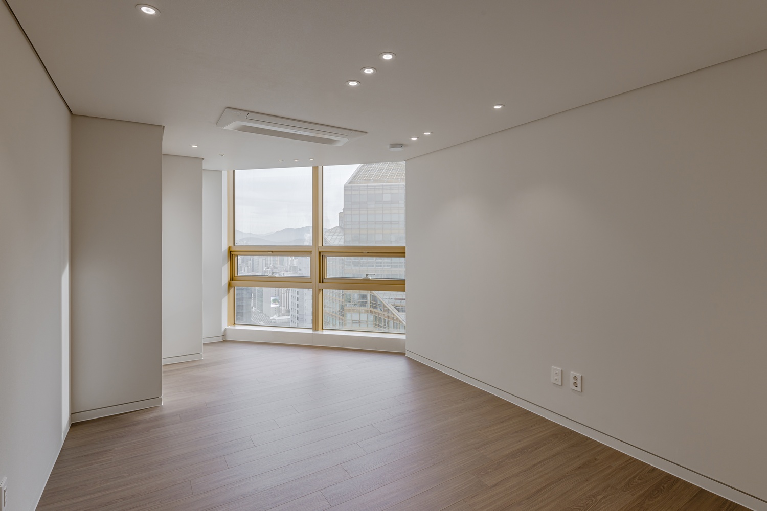 화이트 톤 벽면과 따뜻한 우드 플로어의 조화는 골드 포인트를 더욱 돋보이게 하고, 천장 매립 조명과 간접 조명은 공간에 깊이감을 더해 세련된 무드를 강화합니다.