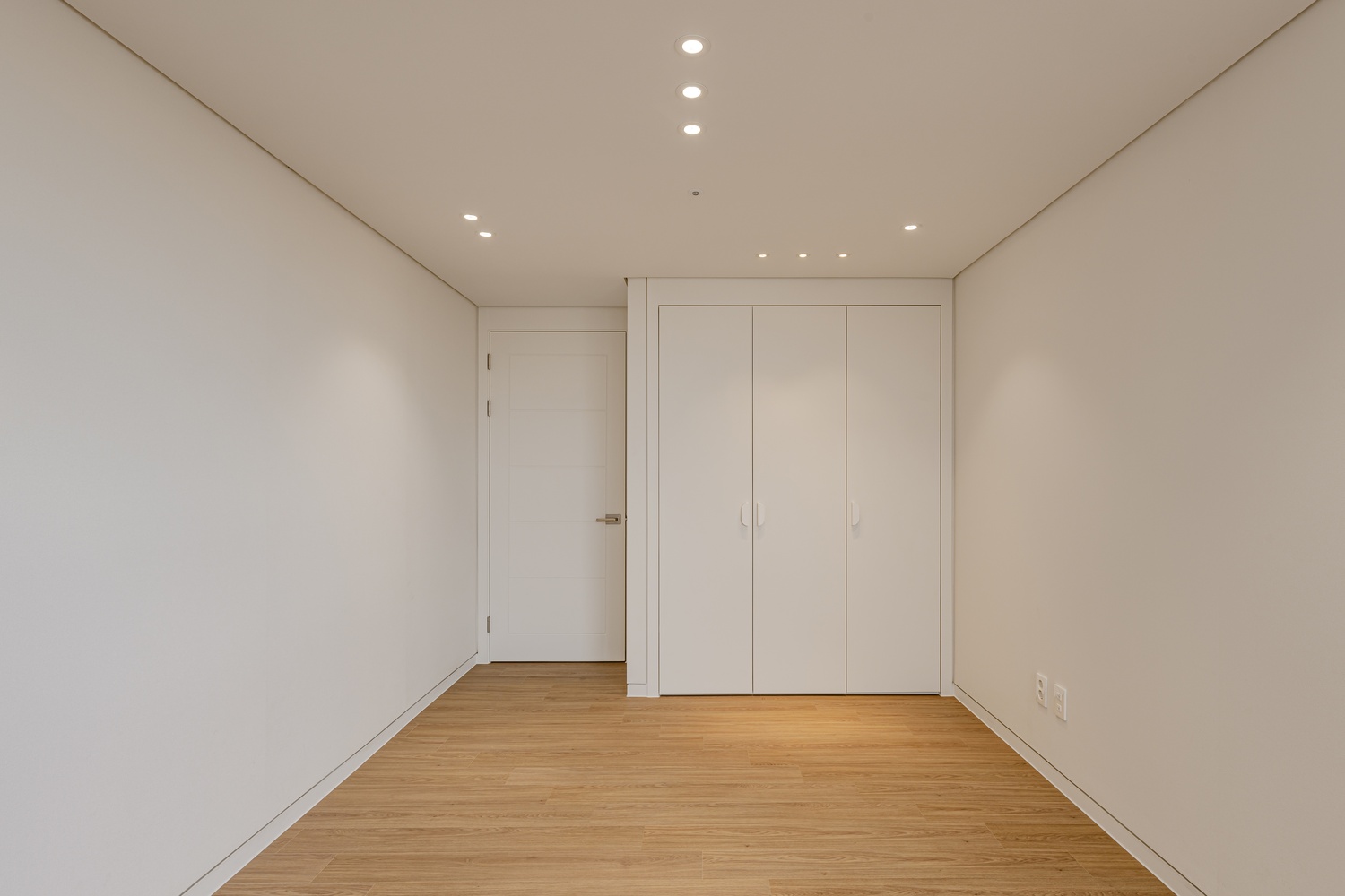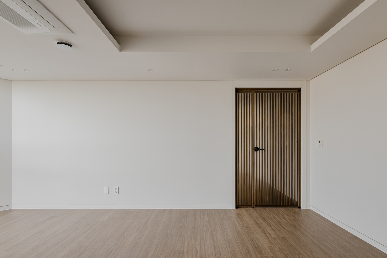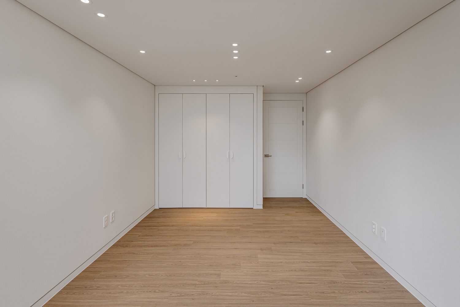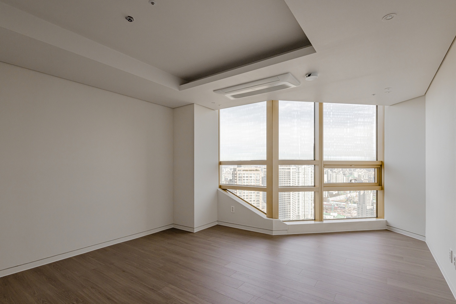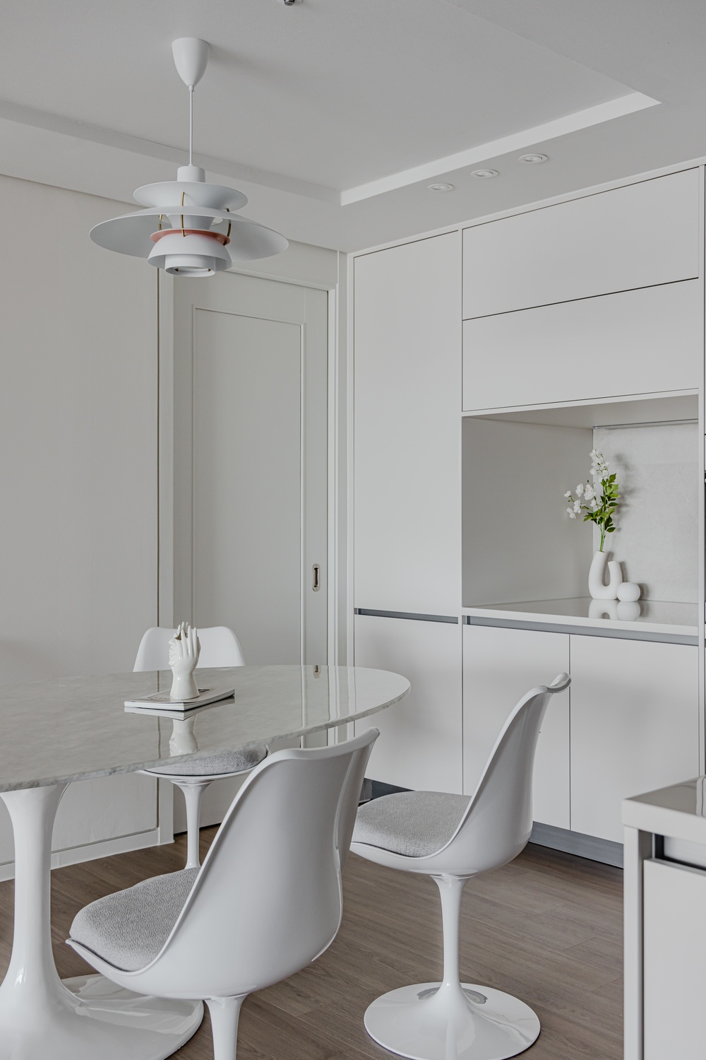 화이트 톤 벽면과 따뜻한 우드 플로어의 조화는 골드 포인트를 더욱 돋보이게 하고, 천장 매립 조명과 간접 조명은 공간에 깊이감을 더해 세련된 무드를 강화합니다.