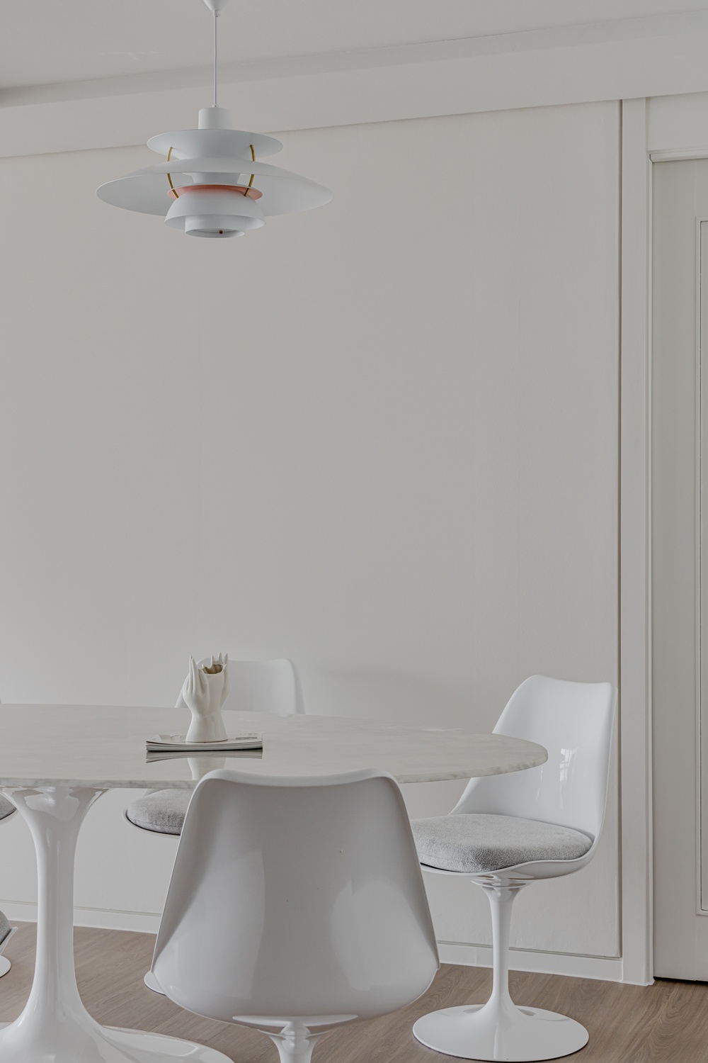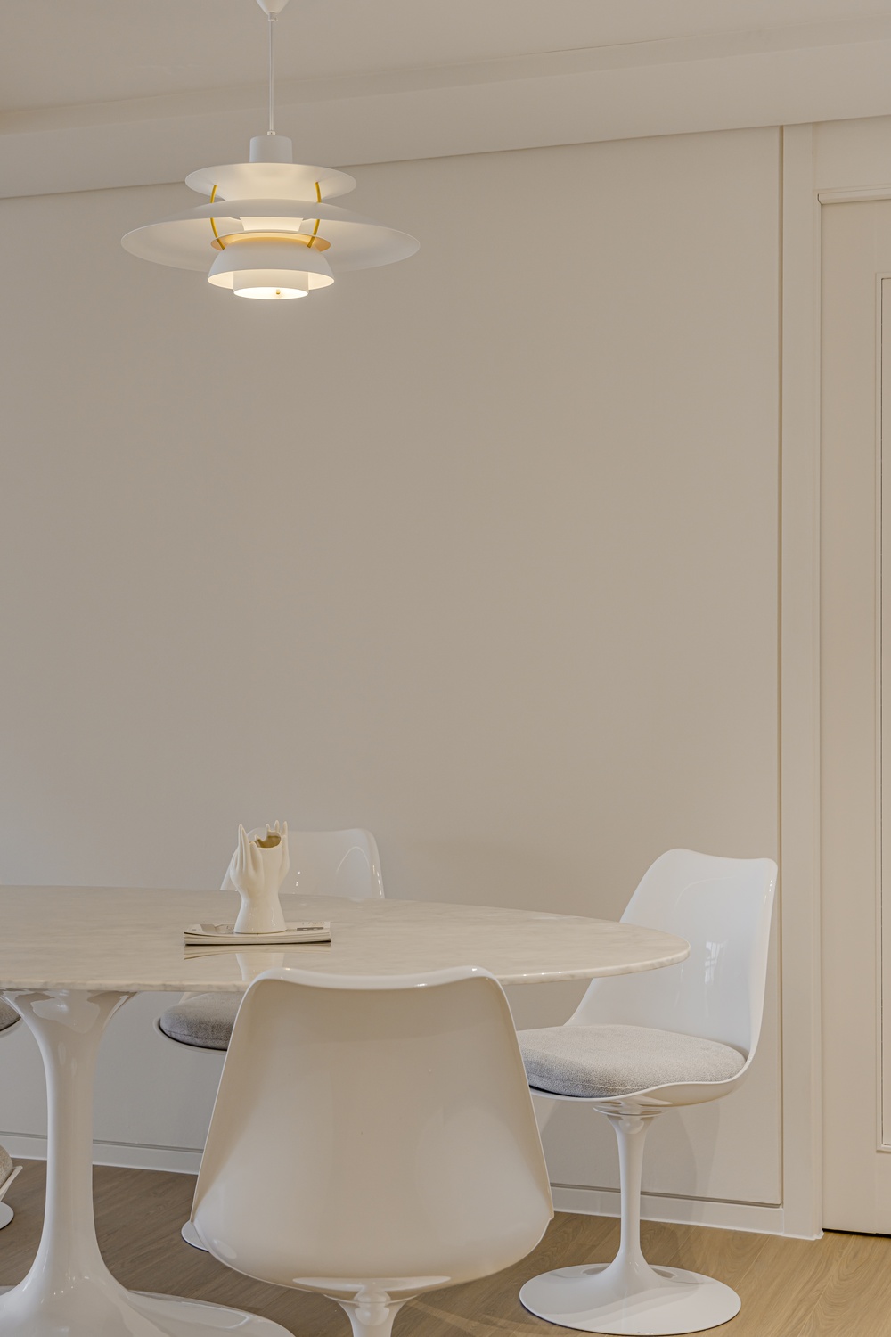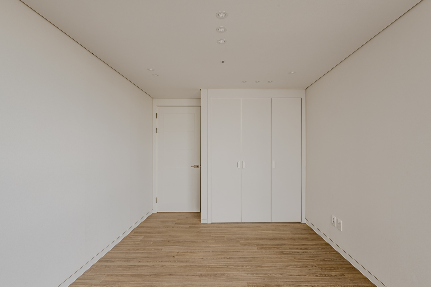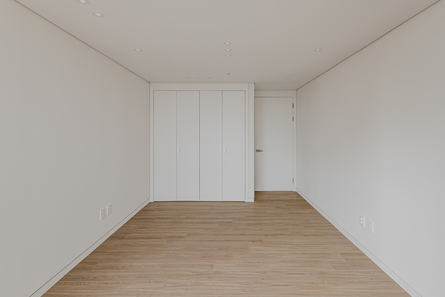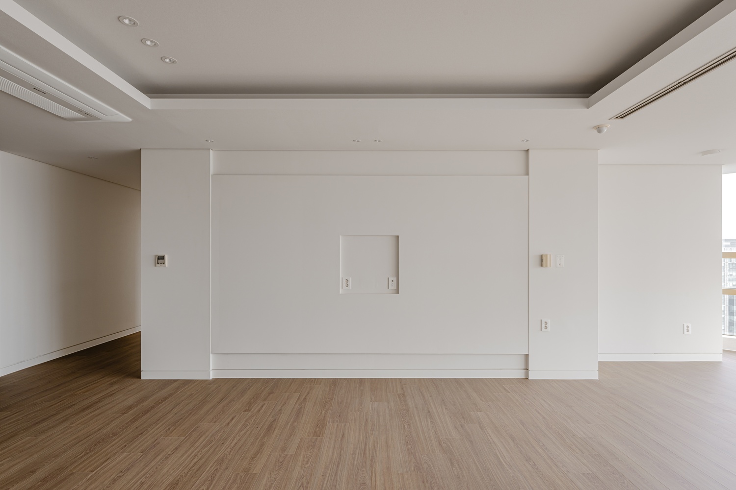 화이트 톤 벽면과 따뜻한 우드 플로어의 조화는 골드 포인트를 더욱 돋보이게 하고, 천장 매립 조명과 간접 조명은 공간에 깊이감을 더해 세련된 무드를 강화합니다.