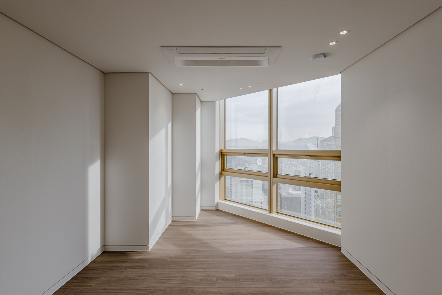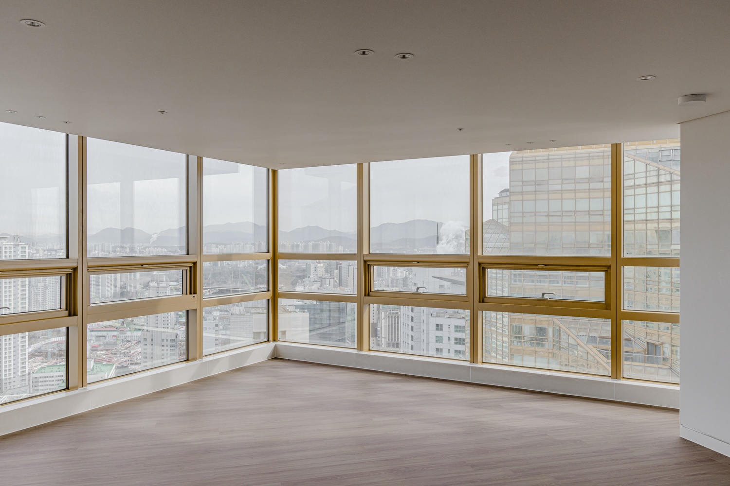 전면을 가득 채운 파노라마 창과 더불어, 고급스러운 골드 프레임이 공간의 품격을 한층 더 높여줍니다. 은은하게 반사되는 골드 컬러는 도시 전경과 자연광을 받아 시간이 흐름에 따라 다양한 분위기를 연출하며, 거실 전체를 고급스러운 분위기로 완성합니다.