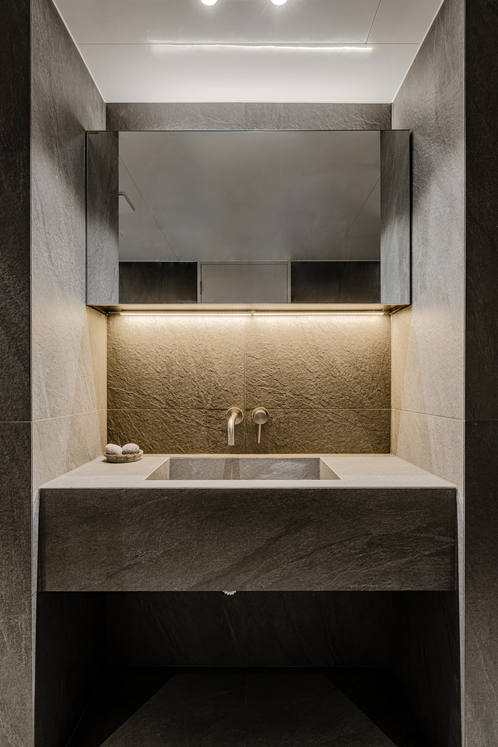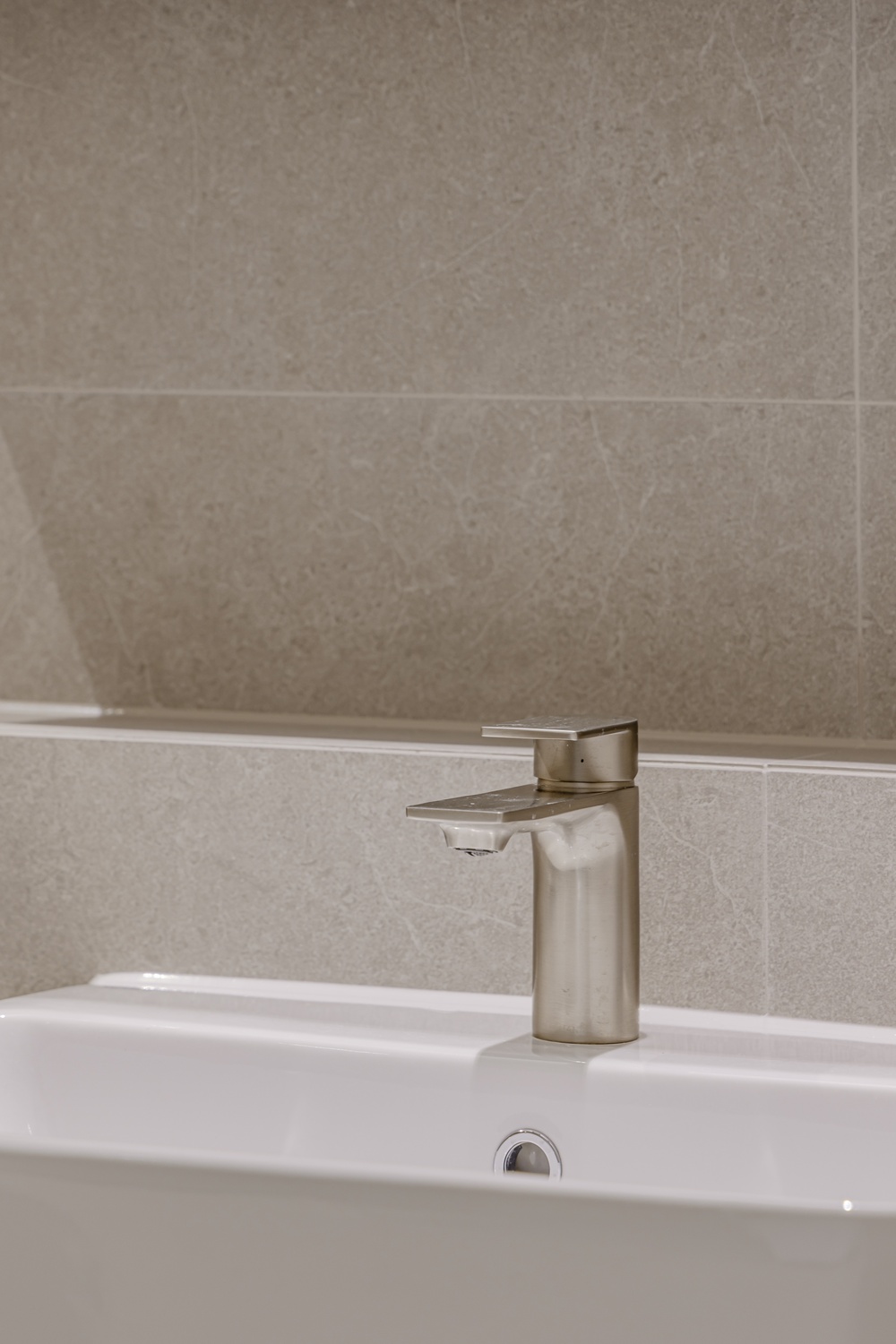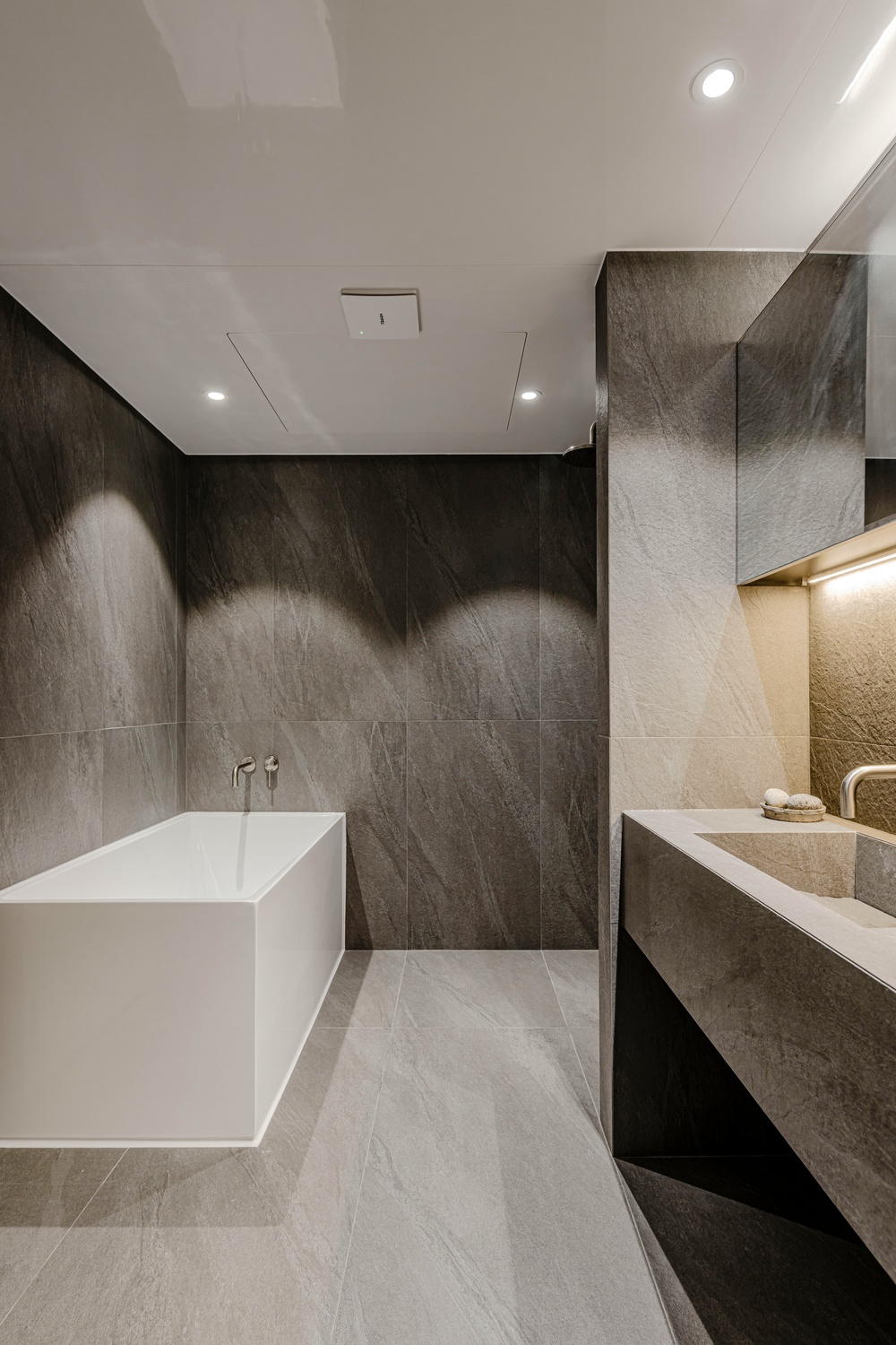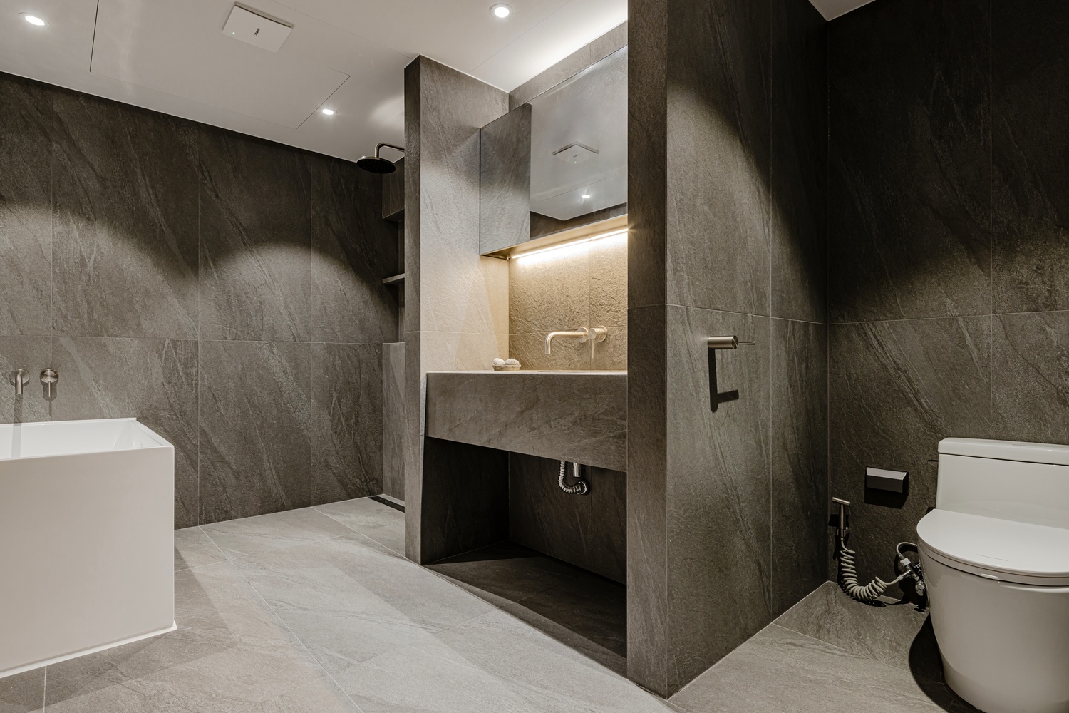 욕실은 톤을 낮춘 스톤 텍스처와 절제된 조명, 정돈된 라인으로 단정하게 완성해 하루를 고요하게 마무리할 수 있는 휴식 공간으로 설계했습니다.