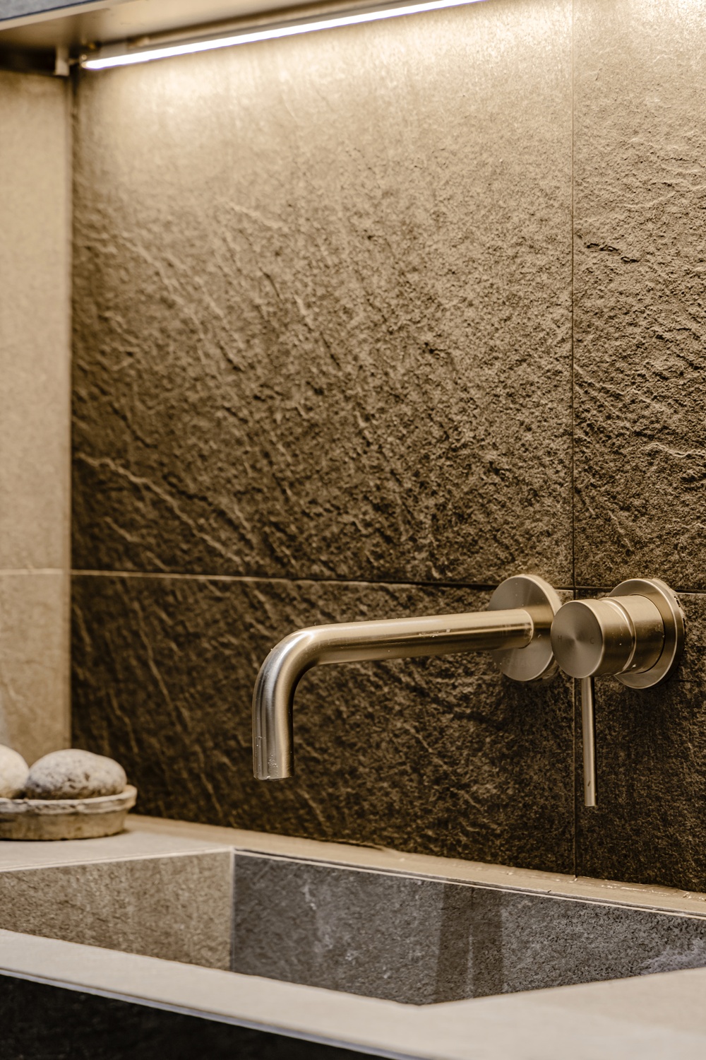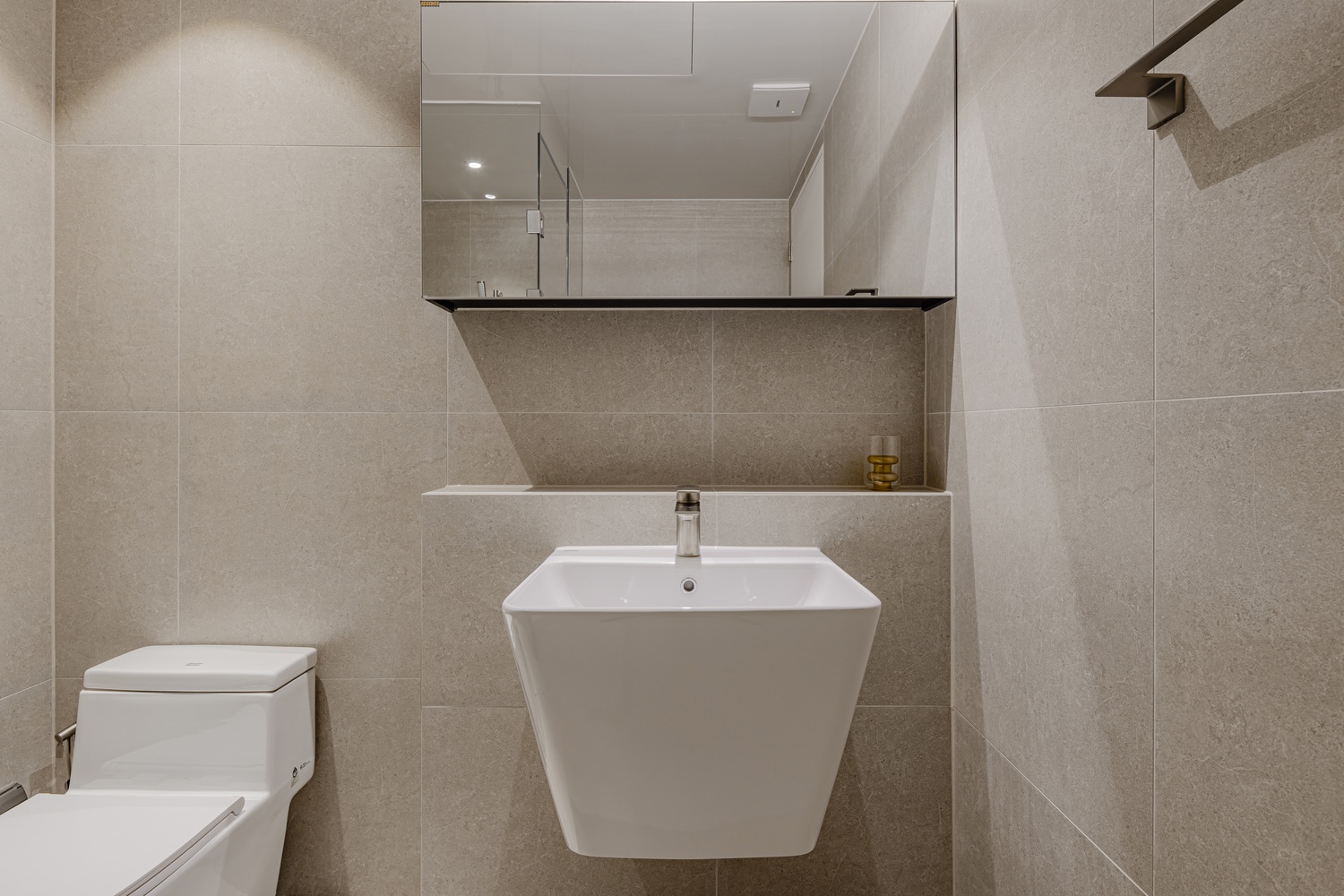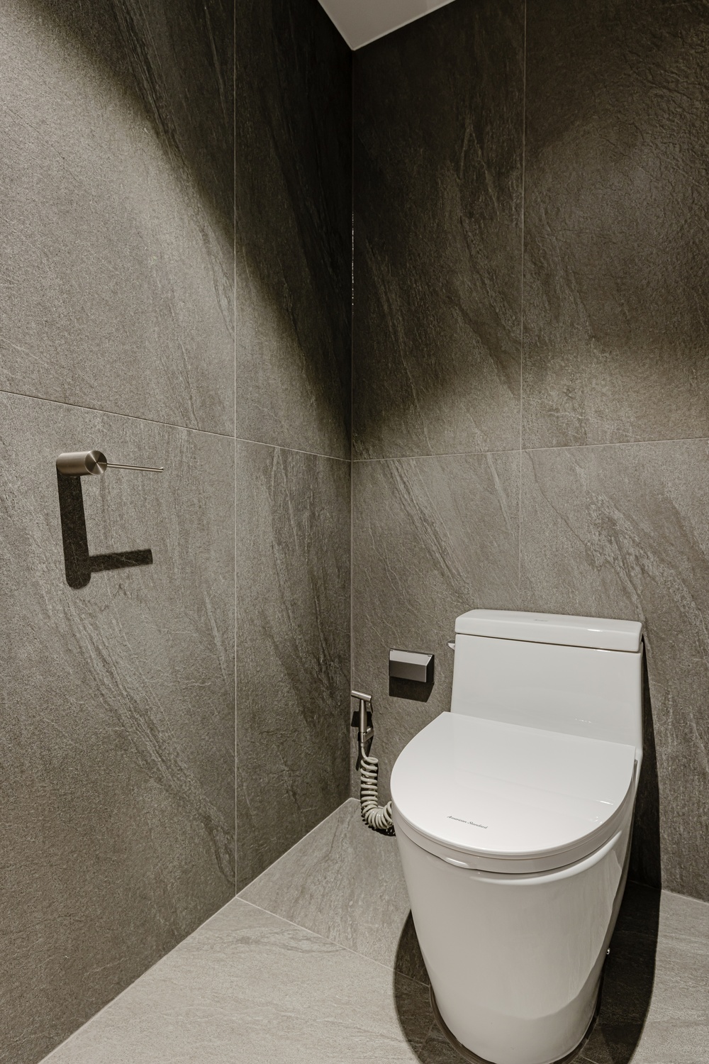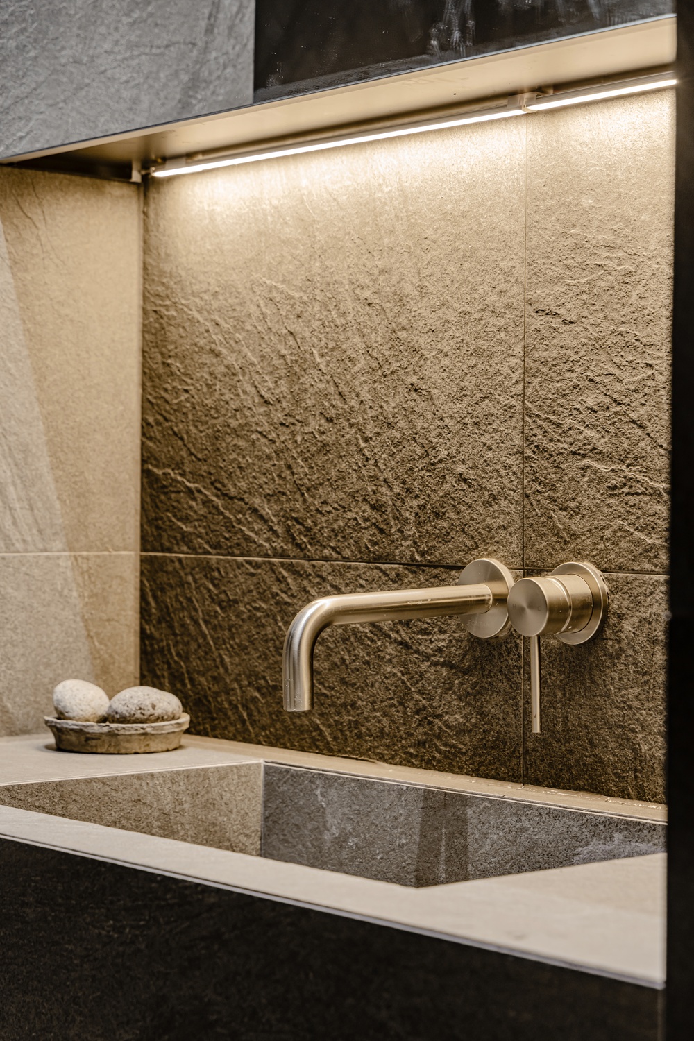 욕실은 톤을 낮춘 스톤 텍스처와 절제된 조명, 정돈된 라인으로 단정하게 완성해 하루를 고요하게 마무리할 수 있는 휴식 공간으로 설계했습니다.