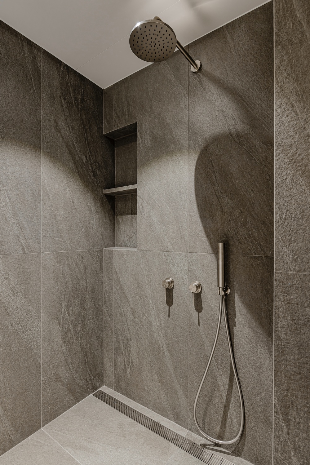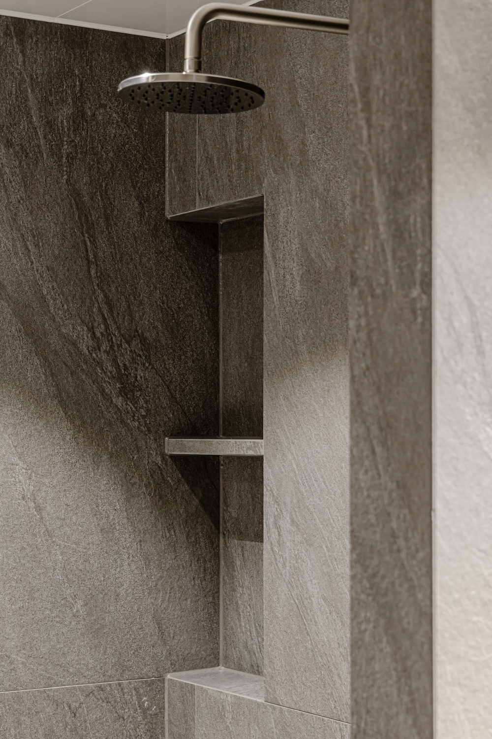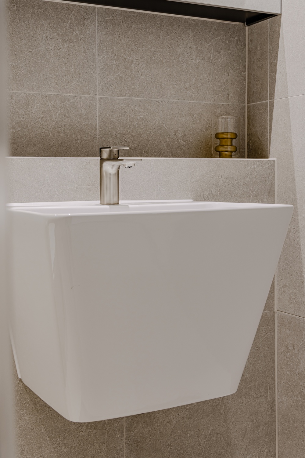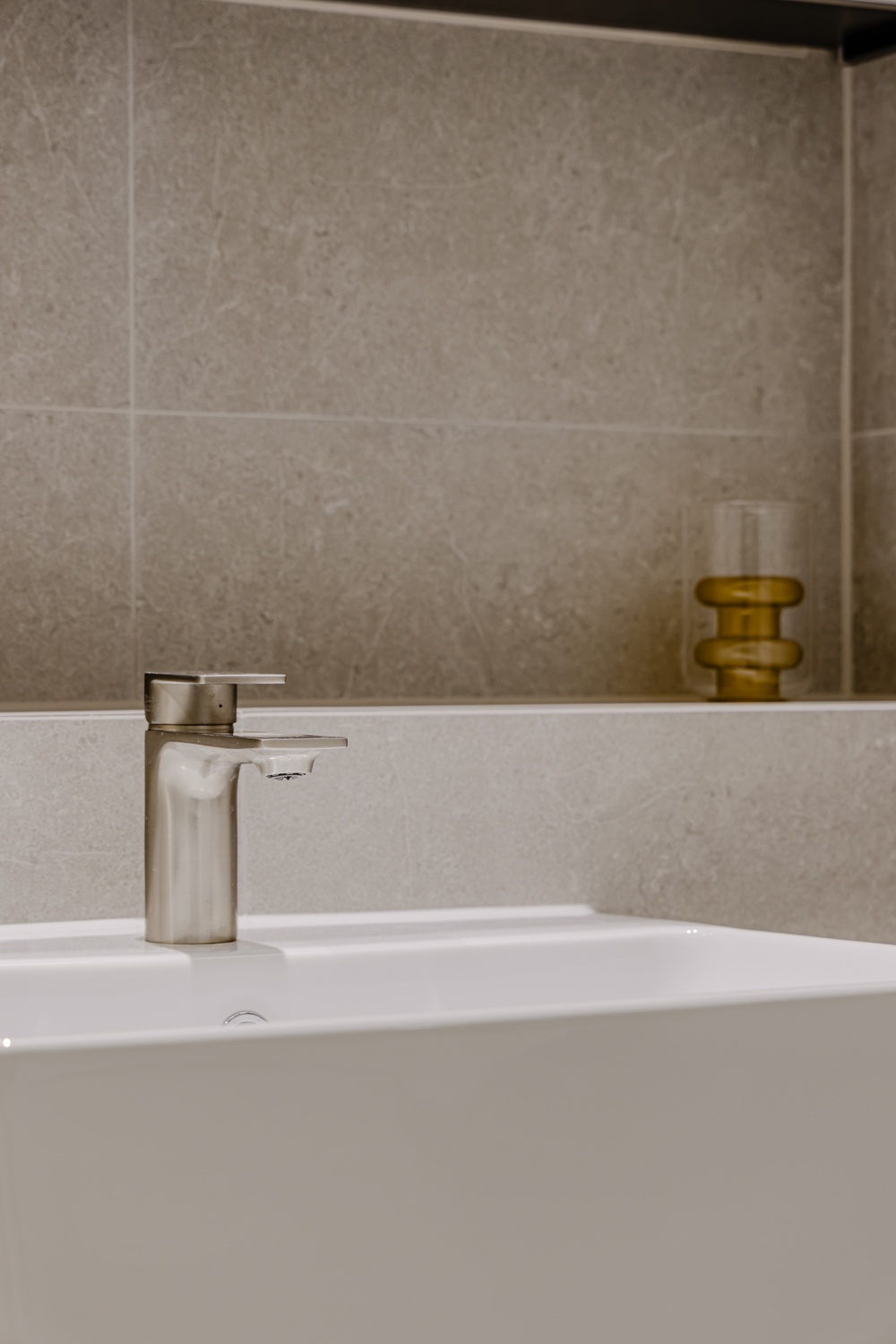 욕실은 톤을 낮춘 스톤 텍스처와 절제된 조명, 정돈된 라인으로 단정하게 완성해 하루를 고요하게 마무리할 수 있는 휴식 공간으로 설계했습니다.