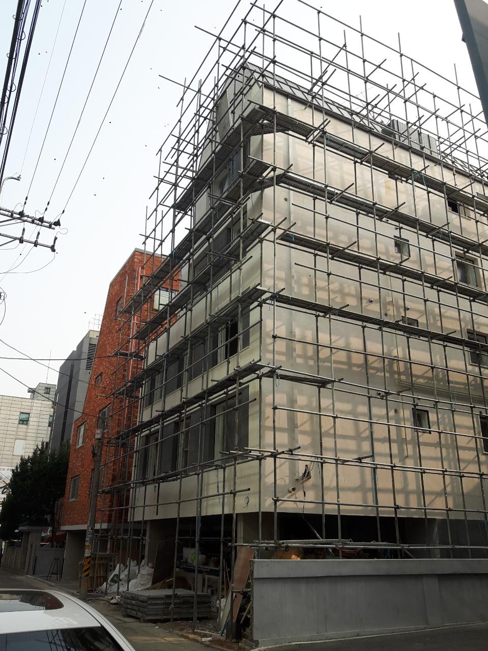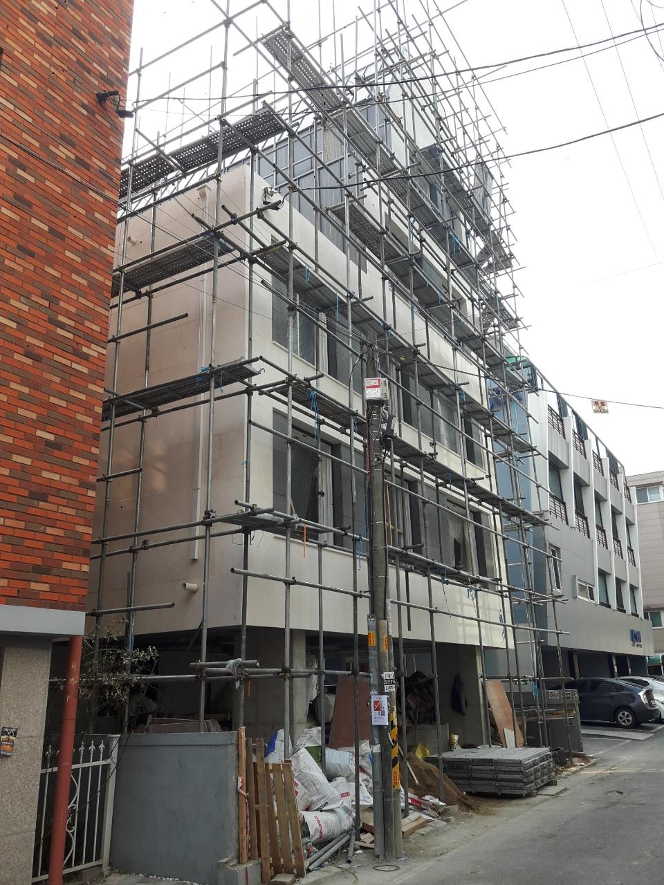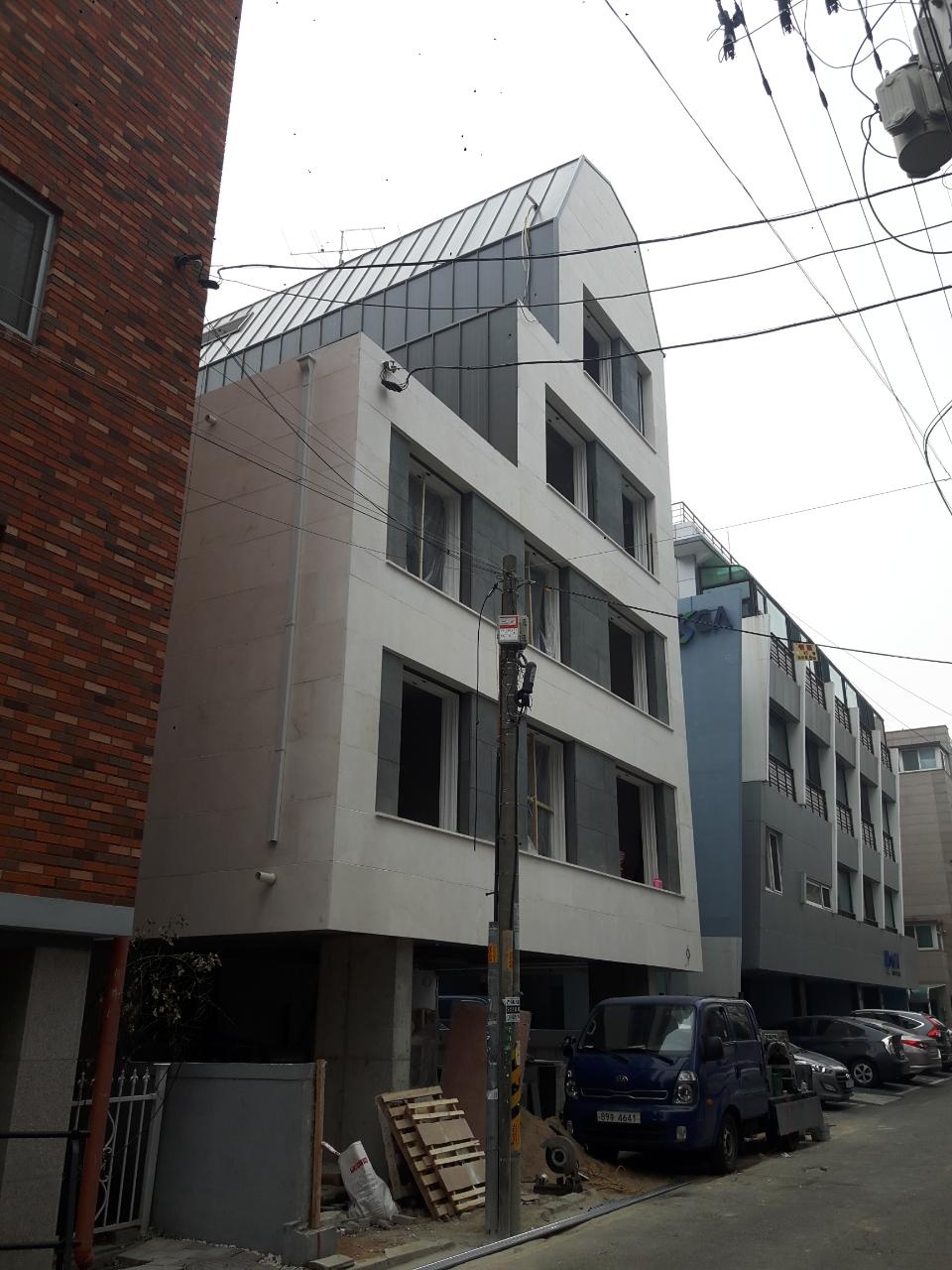 기존의 가로로 긴 입면을 해치지 않고 존치한다. 이 수평적인 오프닝은 그대로 입면의 중요한 요소로 작동하게 한다. 그러나 단순한 패턴형 오프닝은 그 효과가 크지 않다. 그래서 층별로 조금씩 새로운 재료가 전면으로 돌출한다. 이는 가로로 열린 창과 함께 더 큰 입면 강조효과로 나타난다.