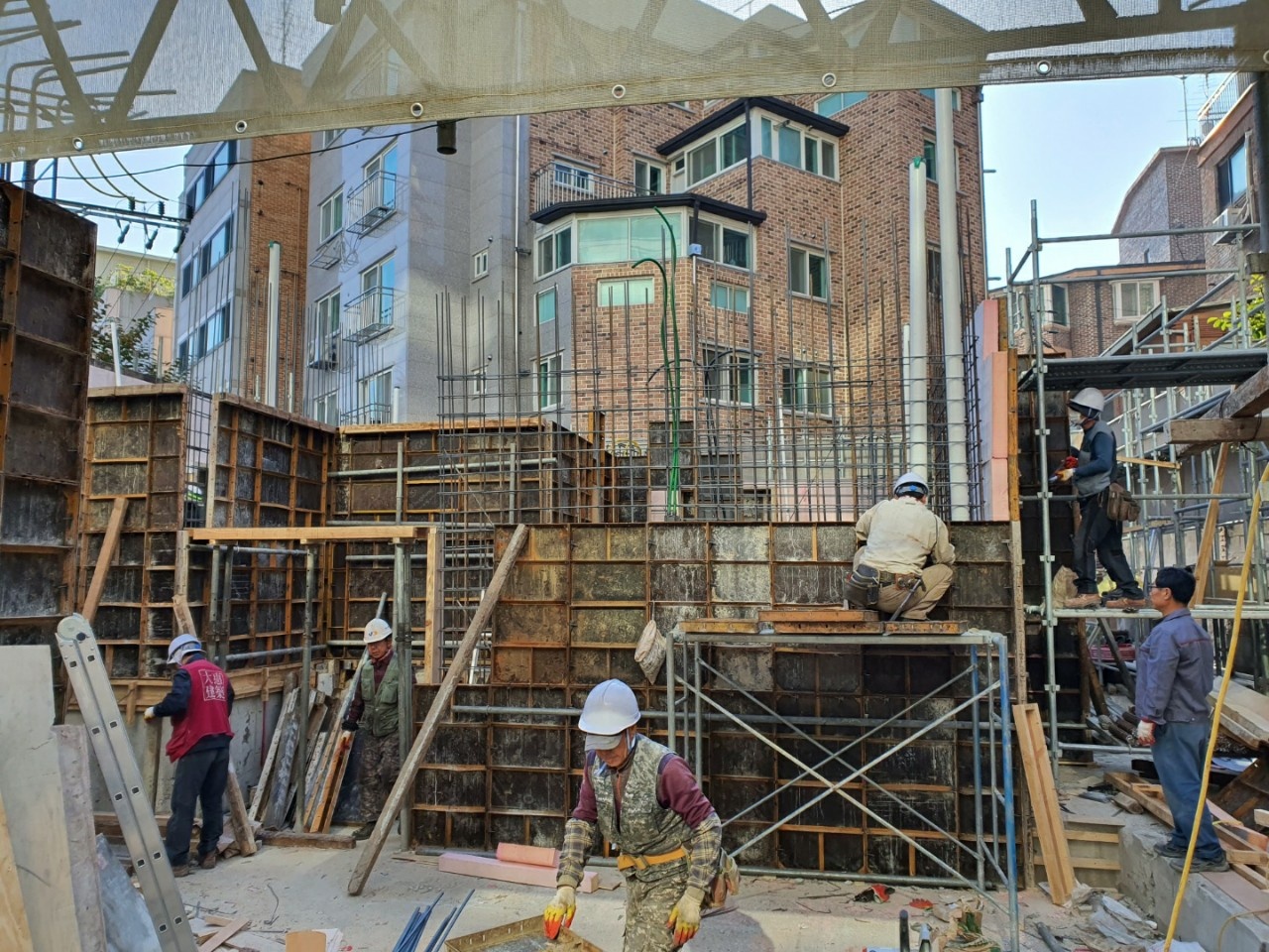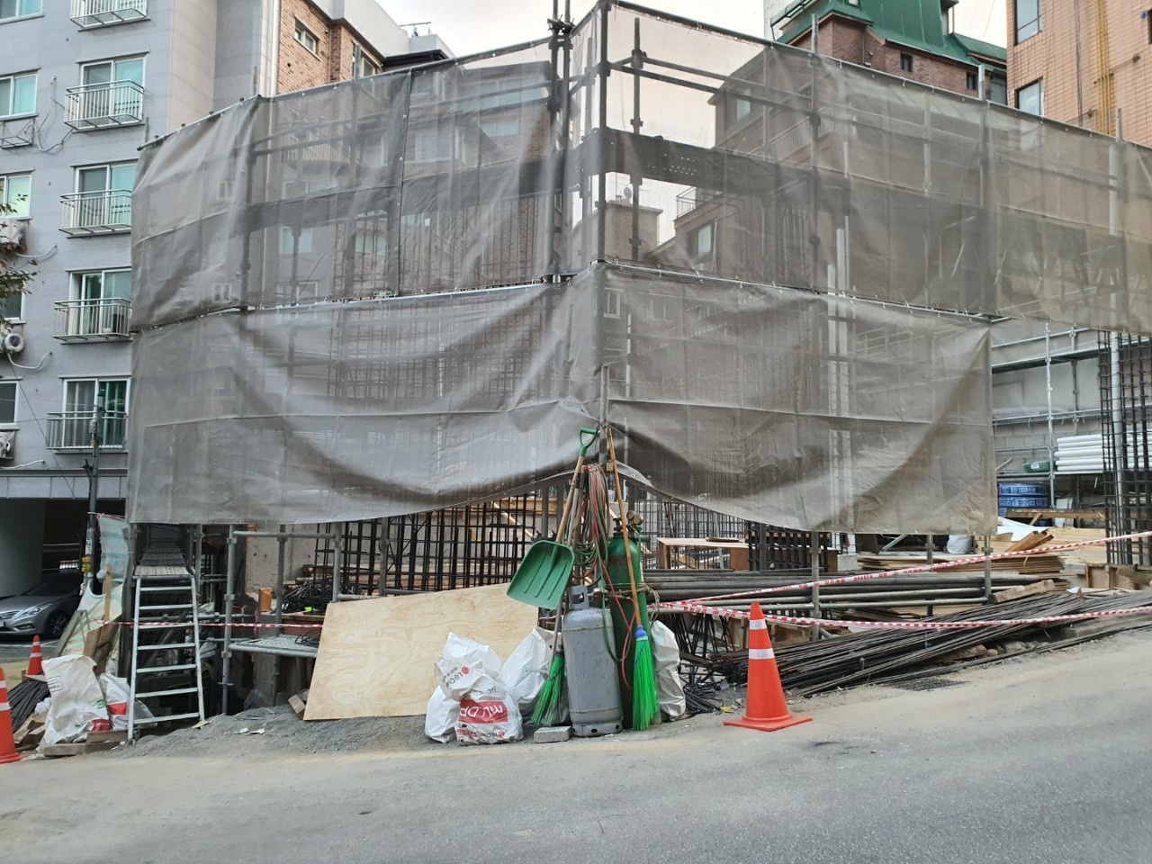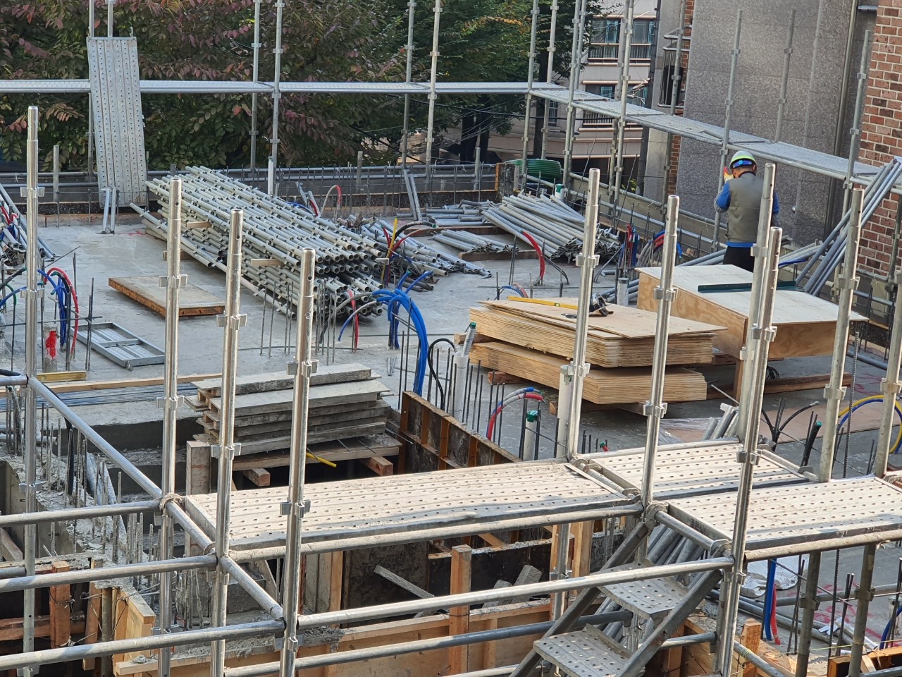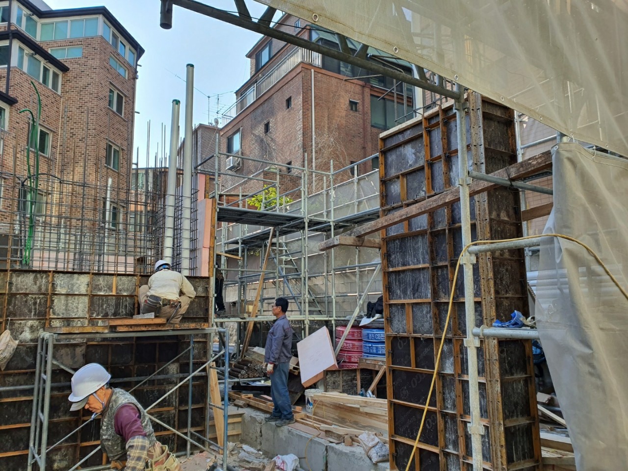 기존의 가로로 긴 입면을 해치지 않고 존치한다. 이 수평적인 오프닝은 그대로 입면의 중요한 요소로 작동하게 한다. 그러나 단순한 패턴형 오프닝은 그 효과가 크지 않다. 그래서 층별로 조금씩 새로운 재료가 전면으로 돌출한다. 이는 가로로 열린 창과 함께 더 큰 입면 강조효과로 나타난다.