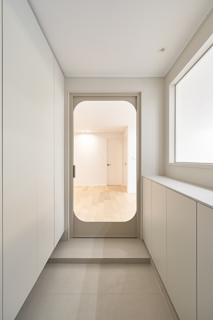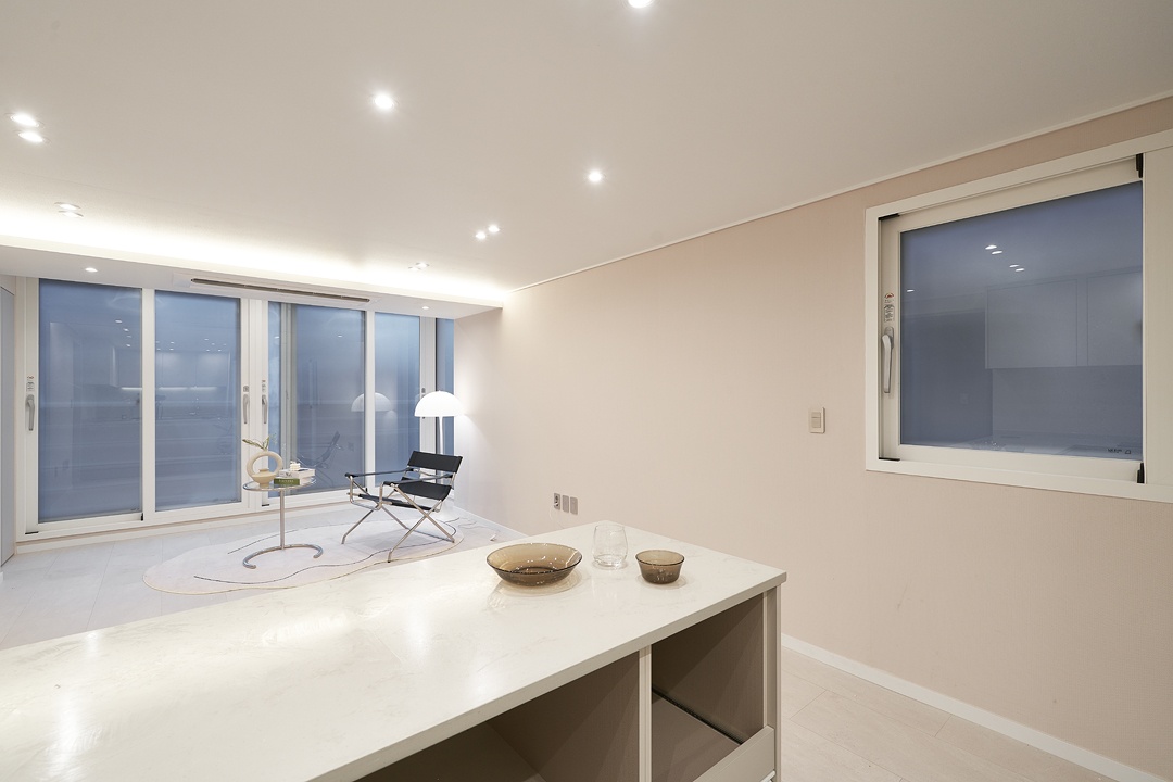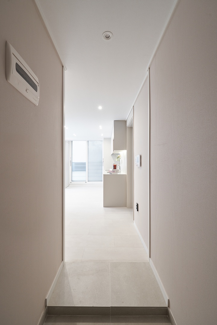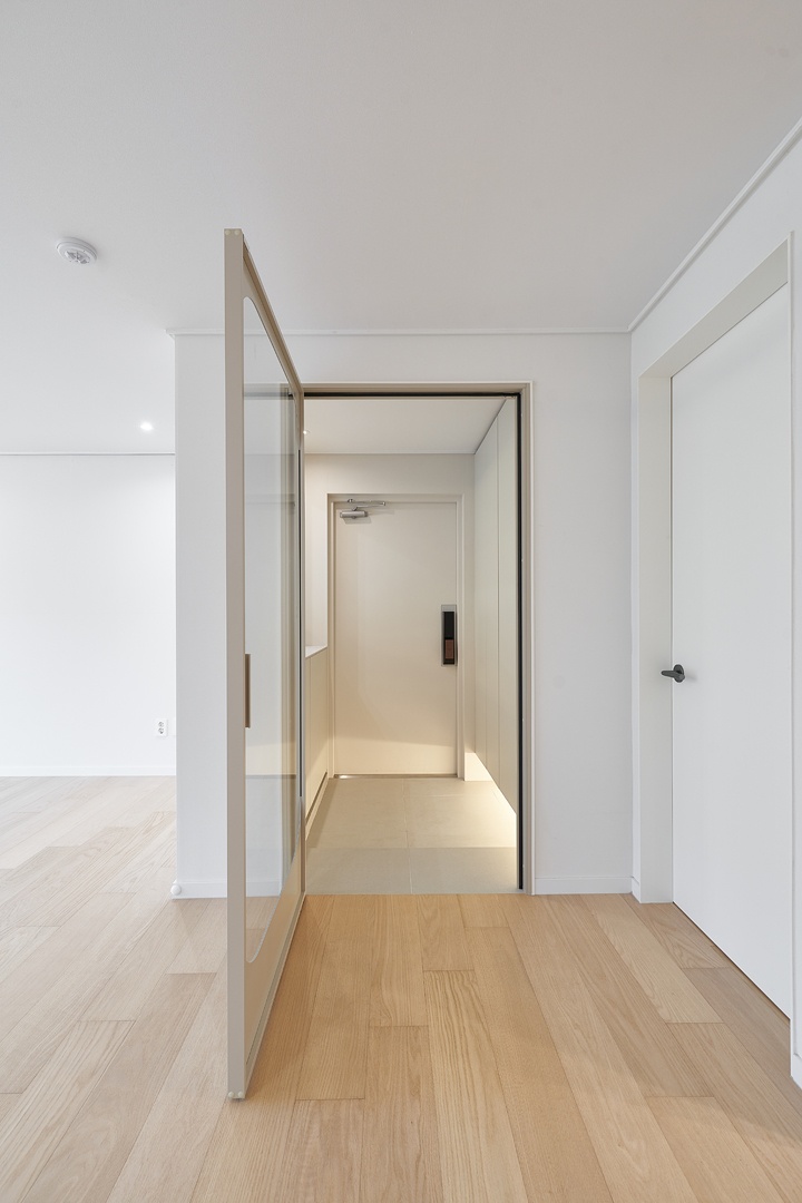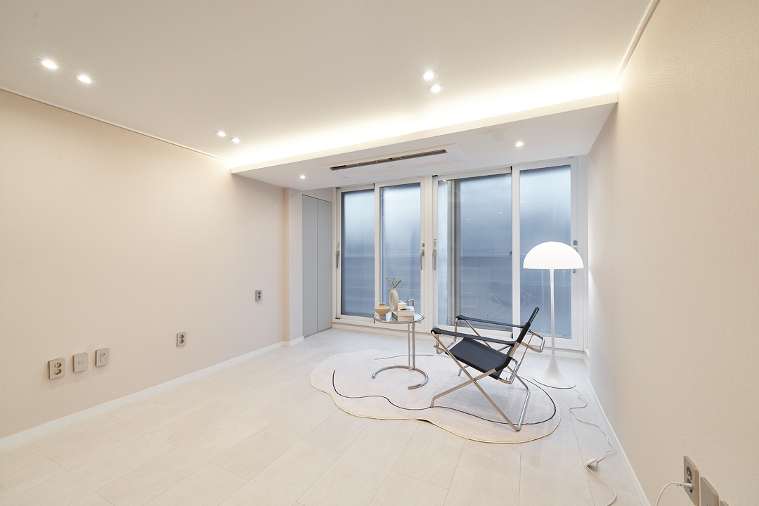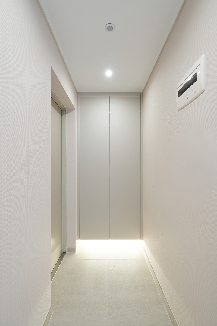 기존의 가로로 긴 입면을 해치지 않고 존치한다. 이 수평적인 오프닝은 그대로 입면의 중요한 요소로 작동하게 한다. 그러나 단순한 패턴형 오프닝은 그 효과가 크지 않다. 그래서 층별로 조금씩 새로운 재료가 전면으로 돌출한다. 이는 가로로 열린 창과 함께 더 큰 입면 강조효과로 나타난다.